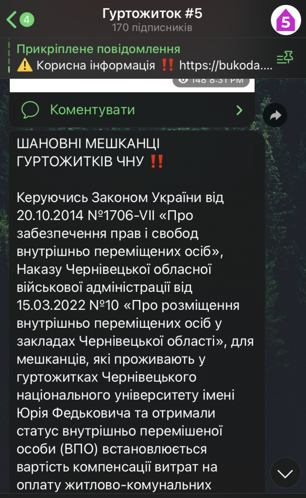 Із вимушених переселенців, які мешкають у гуртожитку Чернівецького національного університету імені Юрія Федьковича, відтепер хочуть брати оплату за проживання. Таке повідомлення надійшло людям у телеграм-каналах гуртожитків.