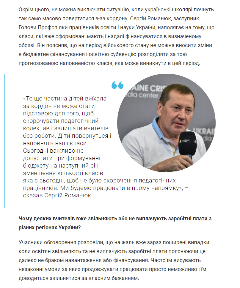Заступник Голови Профспілки Сергій Романюк наполягав на тому, що класи, які вже сформовані мають і надалі фінансуватися в визначеному обсязі. Він пояснював, що на період військового стану не можна вносити зміни в бюджетне фінансування і освітню субвенцію розподіляти за тою прогнозованою наповненістю класів, яка може виникнути в цей період.