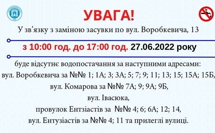 У Чернівцях, в зв’язку з проведенням ремонтних робіт по заміні засувки по вул. Воробкевича, 13, 27 червня 2022 року до 17:00 год. буде відсутнє водопостачання на будинки по наступним вулицям: