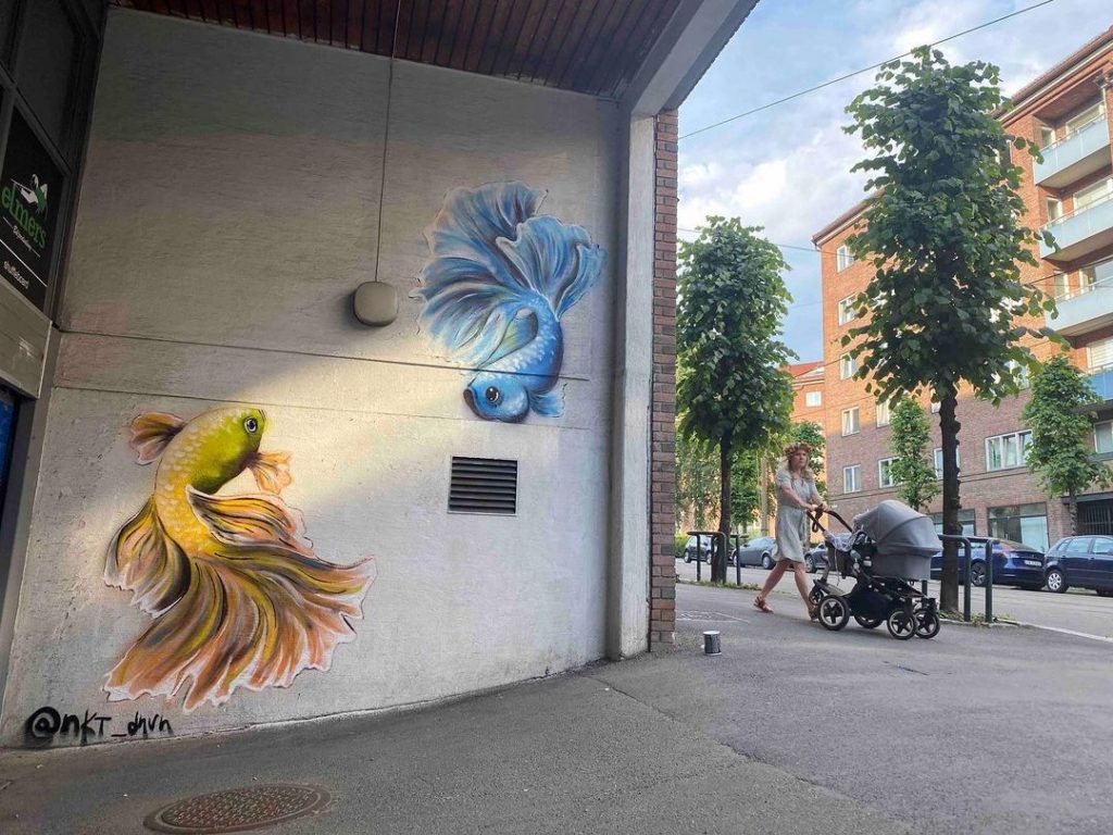 Мурал із рибками в кольорах прапора України можна знайти в Осло на вулиці Гаммерфестґата, 2.