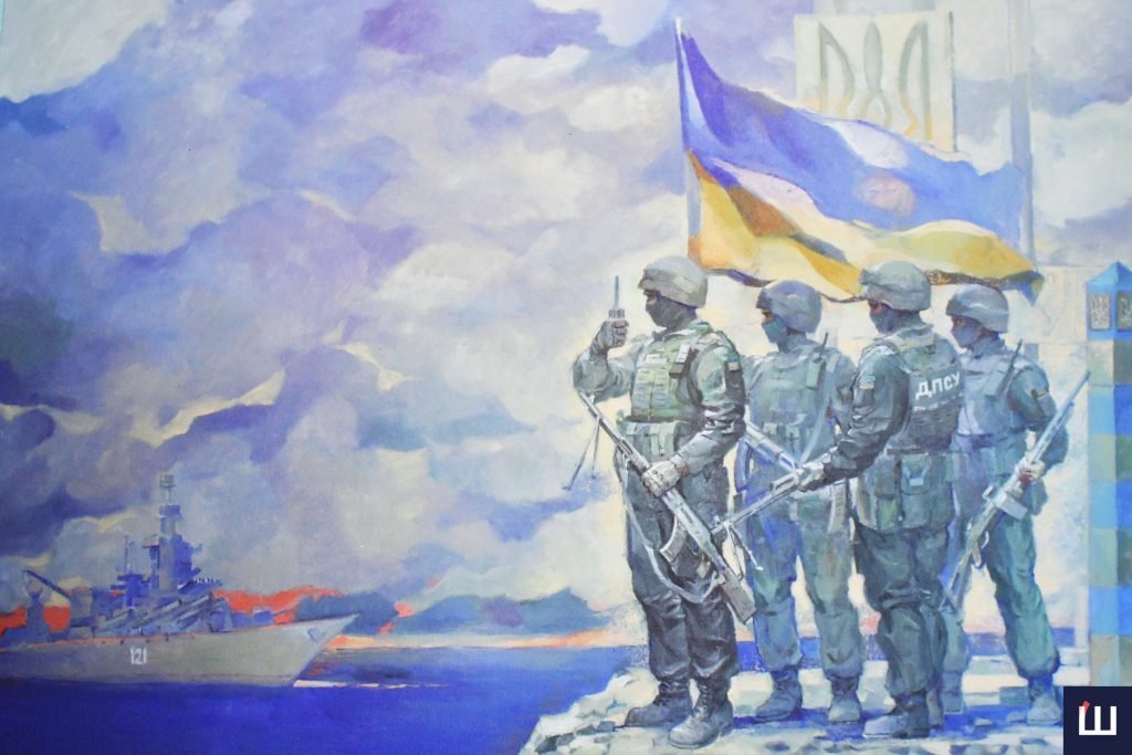 «Вже 9 рік іде війна в країні. Ці події ми також поступово намагаємося відтворити. Тож на виставці є робота, присвячена острову Зміїному. Є картини у формі ескізів. Також є полотно «Битва за КПП “Маринівка”», яка відбулася 2014 року. На ній представлені прикордонники, які відбивали ворога на кордоні з росією. Є картина, присвячена містам, які не підкорилися росії та які зруйнували: Маріуполь, Буча, Ірпінь, Гостомель. Також на картині зображено прапор України як символ держави. Тобто на виставці представлені роботи, які показують військову історію нашої держави у боротьбі за незалежність різних часів. Незалежність, яку ми виборювали і виборюємо й сьогодні», — каже Андрій Холоменюк.