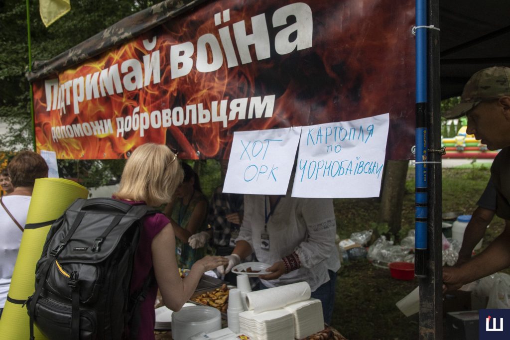 Біля головного входу в парк розташували намети з їжею та сувенірами, трохи далі — польову кухню від військових. Посеред ярмарку проводили аукціон, а пізніше – концерт. Усе, аби зібрати кошти на автомобіль для чернівецької бригади військових, який назвали бандеромобілем.