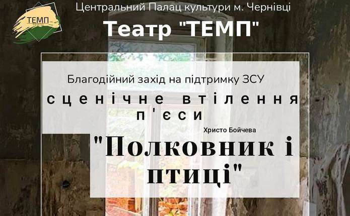 Отож 8 липня 2022 року чернівчан та гостей міста запрошують на благодійний захід – сценічне втілення п’єси Христо Бойчева “Полковник і птиці” у виконанні акторів театру “ТЕМП” та учнів Школи Сценічного мистецтва “Great Stage”.