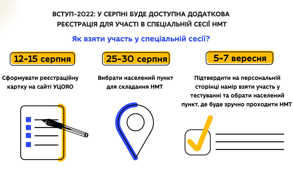 З метою забезпечення права на здобуття вищої освіти осіб, які через військово-політичну ситуацію та наслідки військової агресії рф не змогли зареєструватися для участі у ЗНО (НМТ) в основний і додатковий періоди, отримають можливість зробити це під час спеціального періоду.