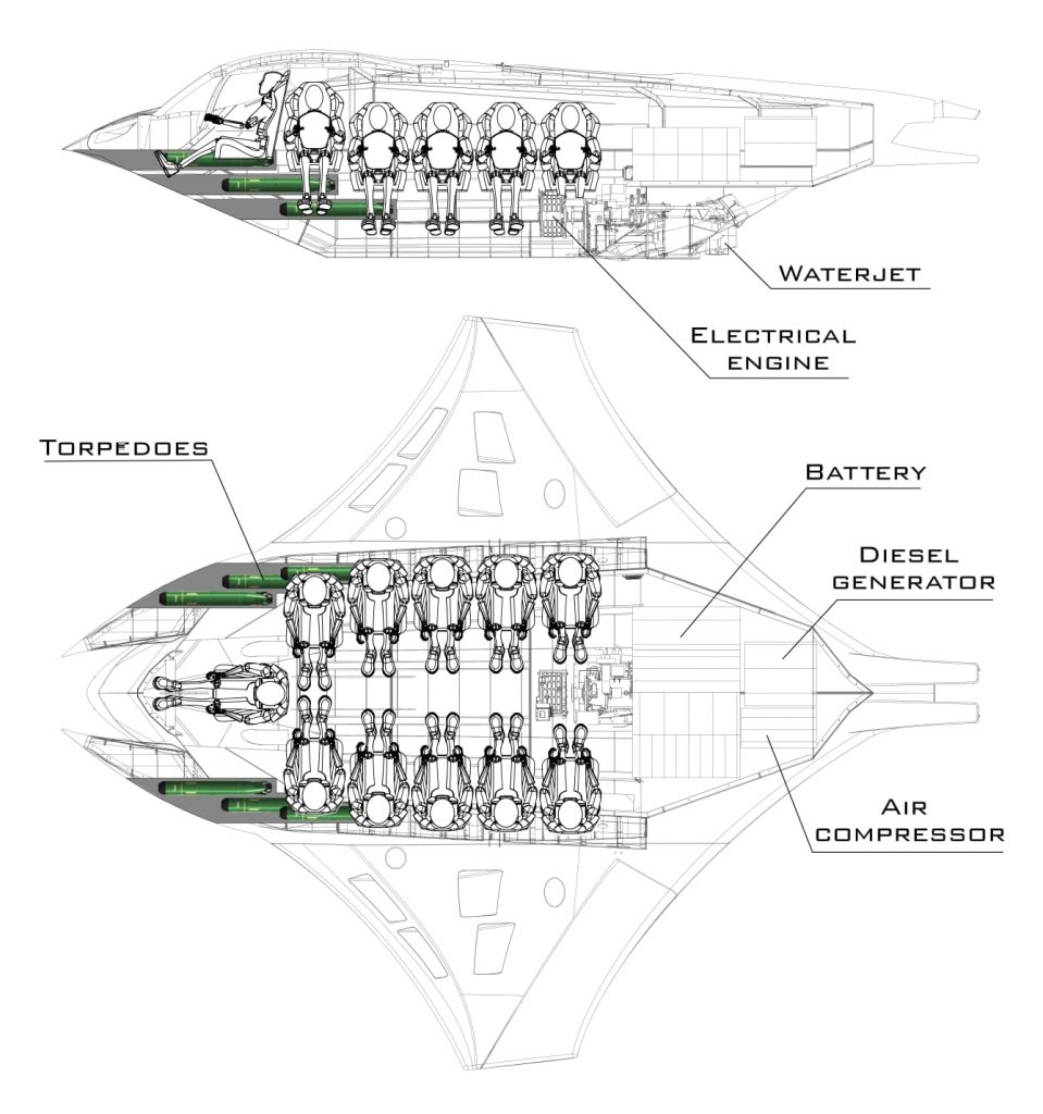 Субмарина може перевозити вантажі до 3,5 тонни, а також екіпаж. Зокрема на борту можна одночасно розмістити до 10 десантників. Є можливість висадки бійців прямо під водою.