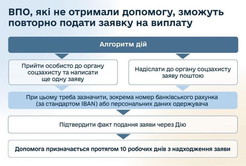 Для цього потрібно до 1 жовтня цього року прийти особисто до органу соцзахисту та написати ще одну заяву. Або ж надіслати таку заяву поштою. При цьому треба зазначити, зокрема номер банківського рахунка (за стандартом IBAN) або персональних даних одержувача, та підтвердити факт подання через Дію попередньої заяви, що була ще навесні (наприклад скріншот). Протягом 10 днів з надходження заяви буде призначена допомога.