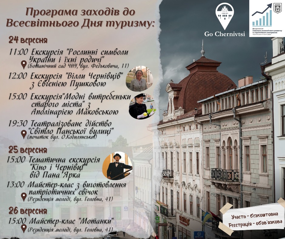 До Всесвітнього Дня туризму у Чернівцях проведуть тематичні екскурсії та майстер-класи для містян та гостей міста. Участь у заходах — безкоштовна, повідомляє Департамент соціально-економічного розвитку та стратегічного планування.