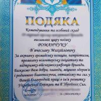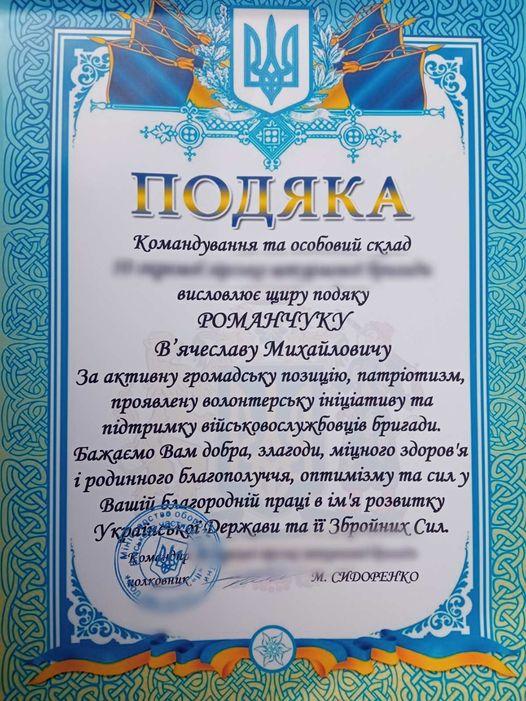 Командування та особовий склад однієї із військових частин Збройних сил України дякують йому за активну громадську позицію, патріотизм, проявлену волонтерську ініціативу і адресують сердечні побажання.