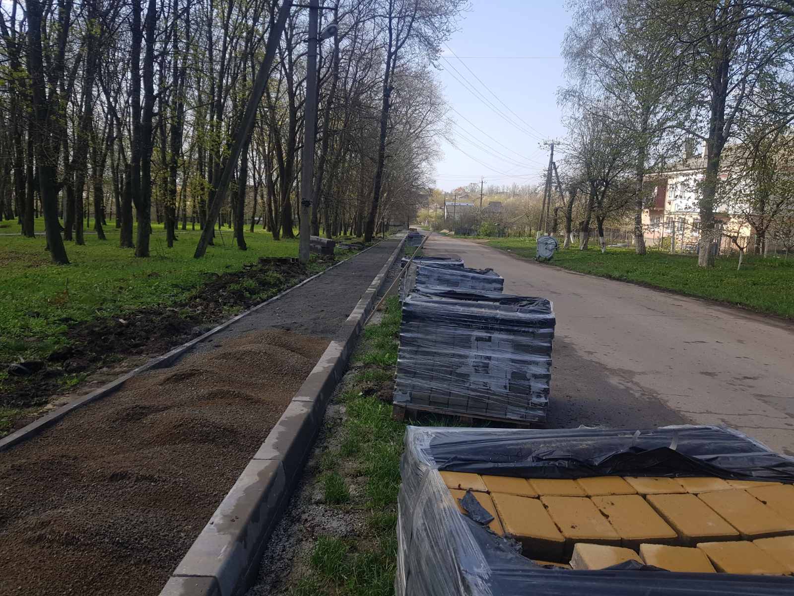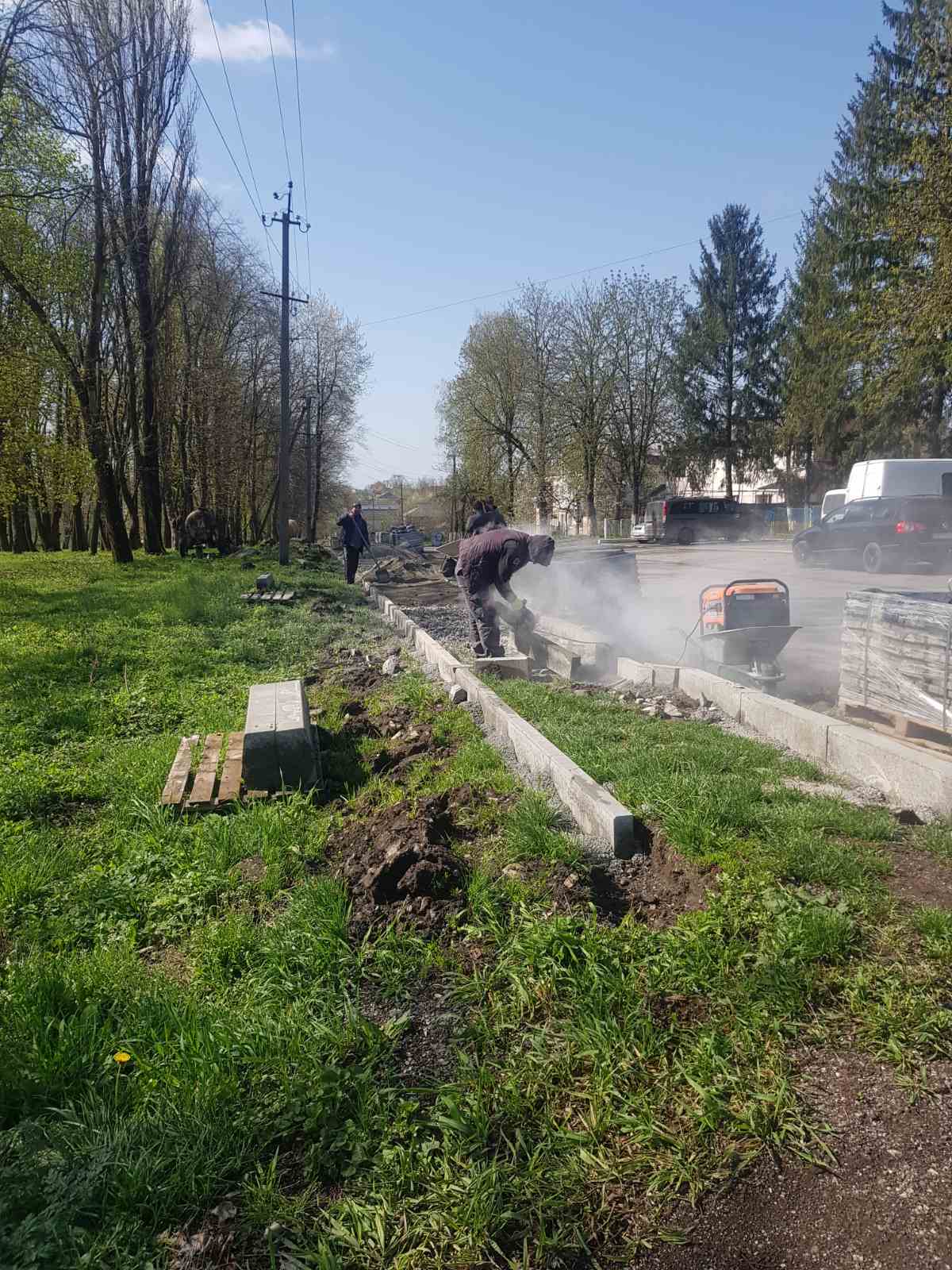 Наразі фахівці встановлюють бордюри та здійснюють облаштування основи під тротуарну плитку.