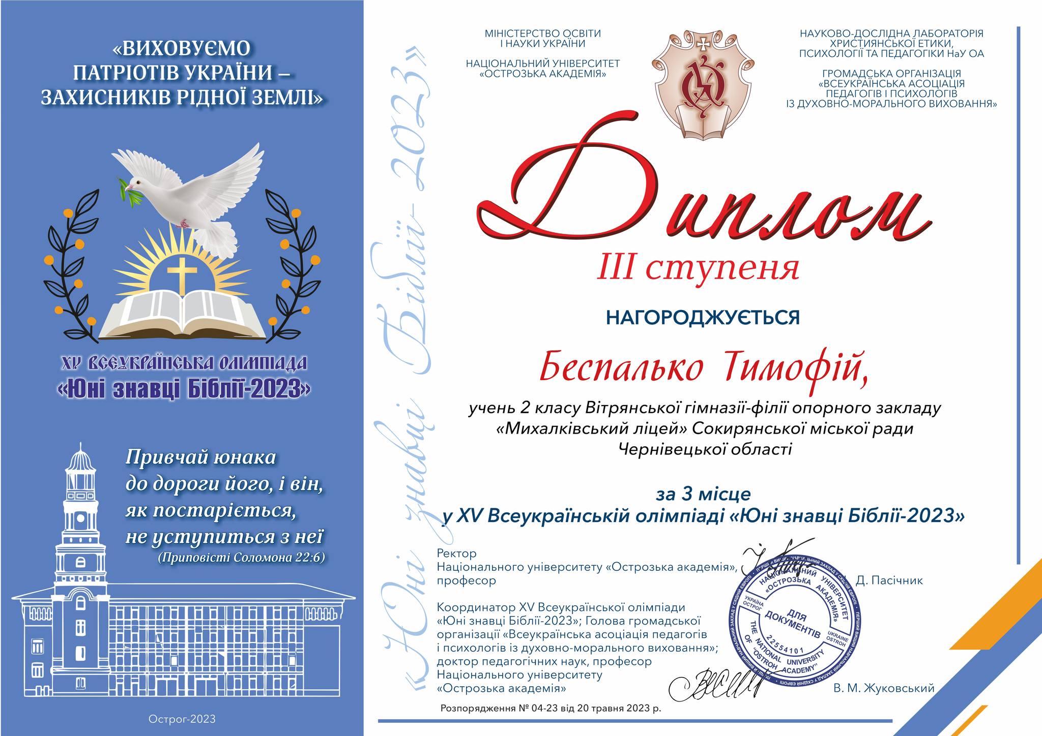 За результатами виконаних завдань та відповідно до рішення журі,  Дипломом ІІІ ступеня нагороджено Тимофія Беспалька, учня 2 класу Вітрянської гімназії-філії опорного закладу «Михалківський ліцей».