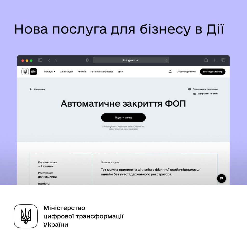 «Хочете закрити бізнес? Тепер це можна зробити за 1 секунду на порталі “Дія” без участи реєстратора. Більше не потрібно чекати, поки заяву опрацює людина — все автоматично», — йдеться у повідомленні.