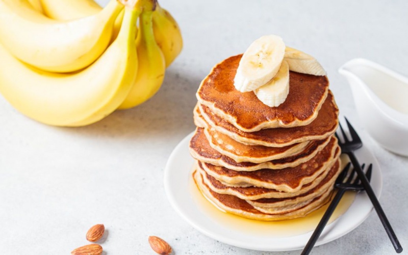 З’єднайте всі інгредієнти та посмажте на сковороді. Оладки виходять ніжні з яскравим та насиченим банановим смаком.