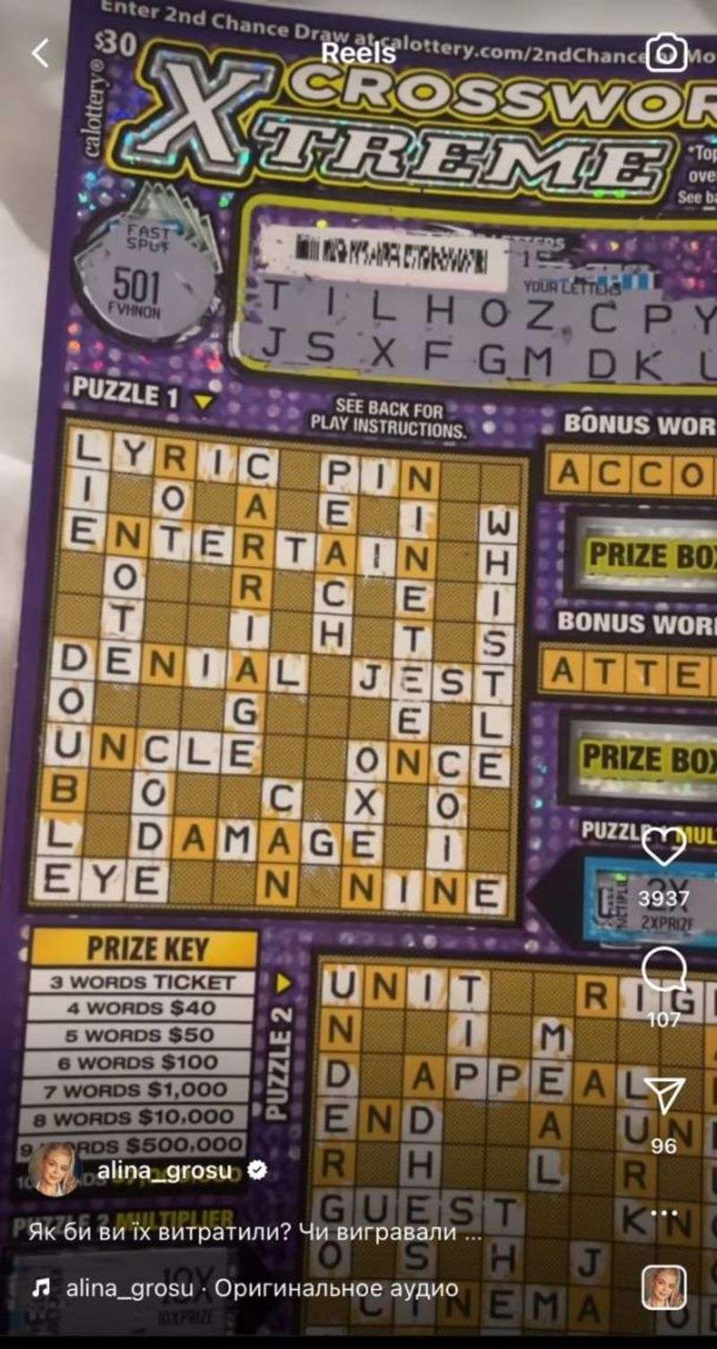 В Instagram виконавиця поділилася, що вперше в житті купила лотерейний білет. Аліна обрала той, де треба розгадувати кросворди. Білет виявися виграшним. Гросу витратила 30 доларів, а заробила 270.