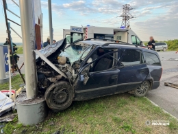 Після зіткнення мікроавтобус перекинувся, а легковий автомобіль в’їхав в табло АЗС.