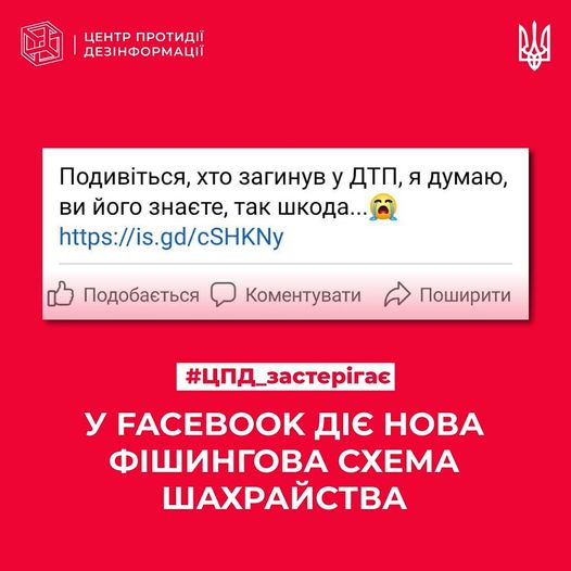У соціальній мережі Facebook зловмисники масово тегають публічні сторінки або надсилають користувачам спам-повідомлення з текстом: «Подивіться, хто загинув у ДТП, я думаю, ви його знаєте, так шкода…».