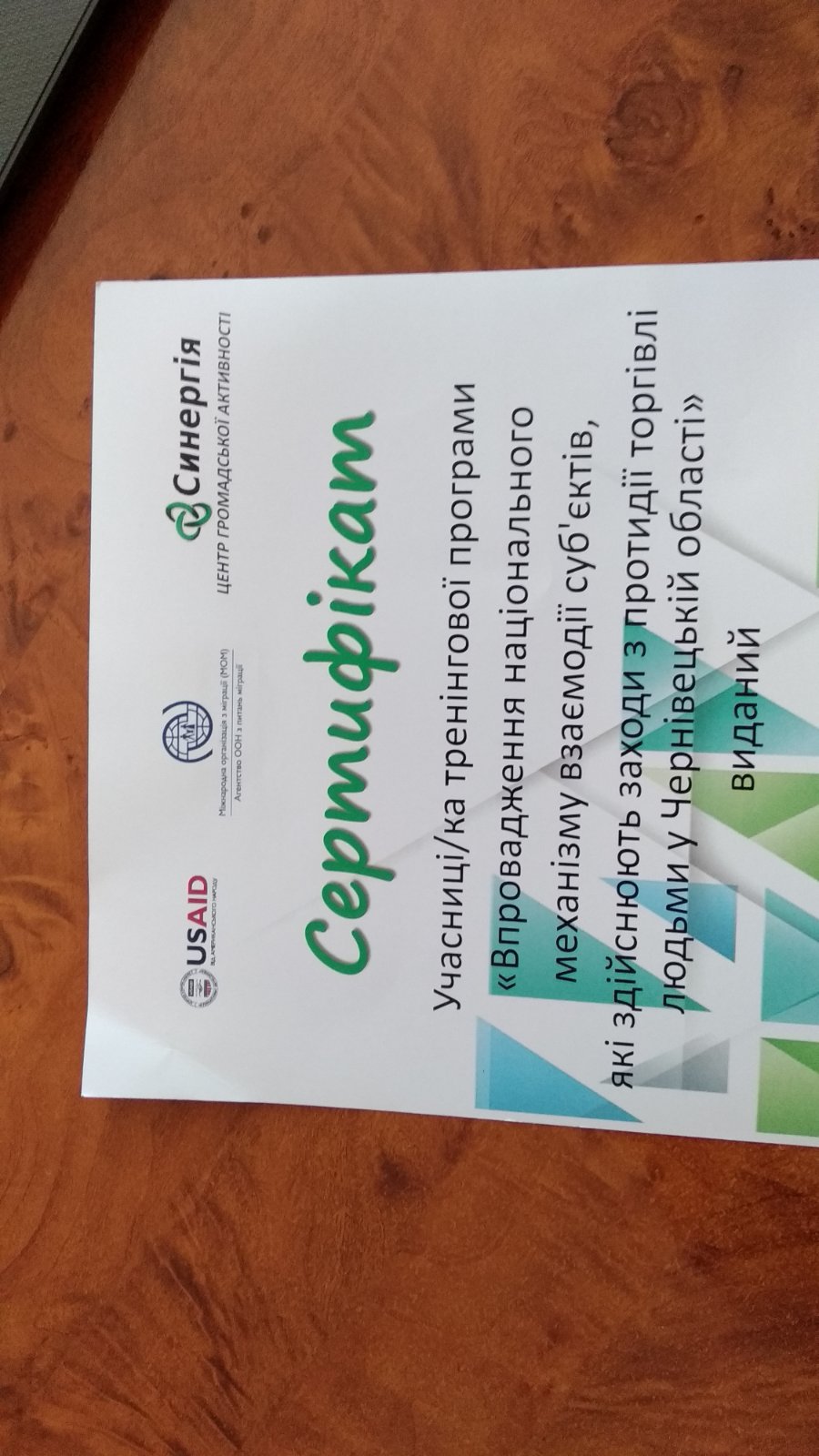 Тренінг відбувався в межах проекту «Впровадження національного механізму взаємодії суб’єктів, які здійснюють заходи в сфері протидії торгівлі людьми у Чернівецькій області» (виконавець – ГО «Центр громадської активності «Синергія»), за сприяння представництва Міжнародної Організації з Міграції (МОМ) в Україні та за фінансової підтримки USAID.