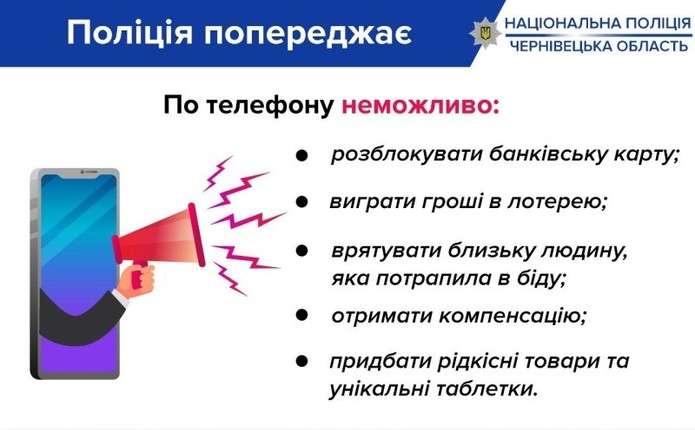 Правоохоронці закликають буковинців нікому та ні за яких обставин не розголошувати свої персональні дані і конфіденційну інформацію про банківські рахунки. Також поліцейські застерігають не перераховувати кошти на невідомі рахунки, навіть якщо вас про це просять нібито знайомі чи родичі. Перш за все постарайтеся зв’язатися з тим, хто звернувся до вас по допомогу.