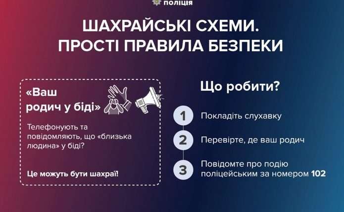Поліцейські нагадують: у випадку дзвінка «Ваш родич у біді», перш за все спробуйте зв’язатися з ним, або зателефонуйте у поліцію та перевірте інформацію. В жодному випадку не перераховуйте та не передавайте гроші незнайомцям! Якщо ви потрапили до пастки аферистів або відносно вас намагалися вчинити шахрайські дії, негайно телефонуйте на спецлінію «102».