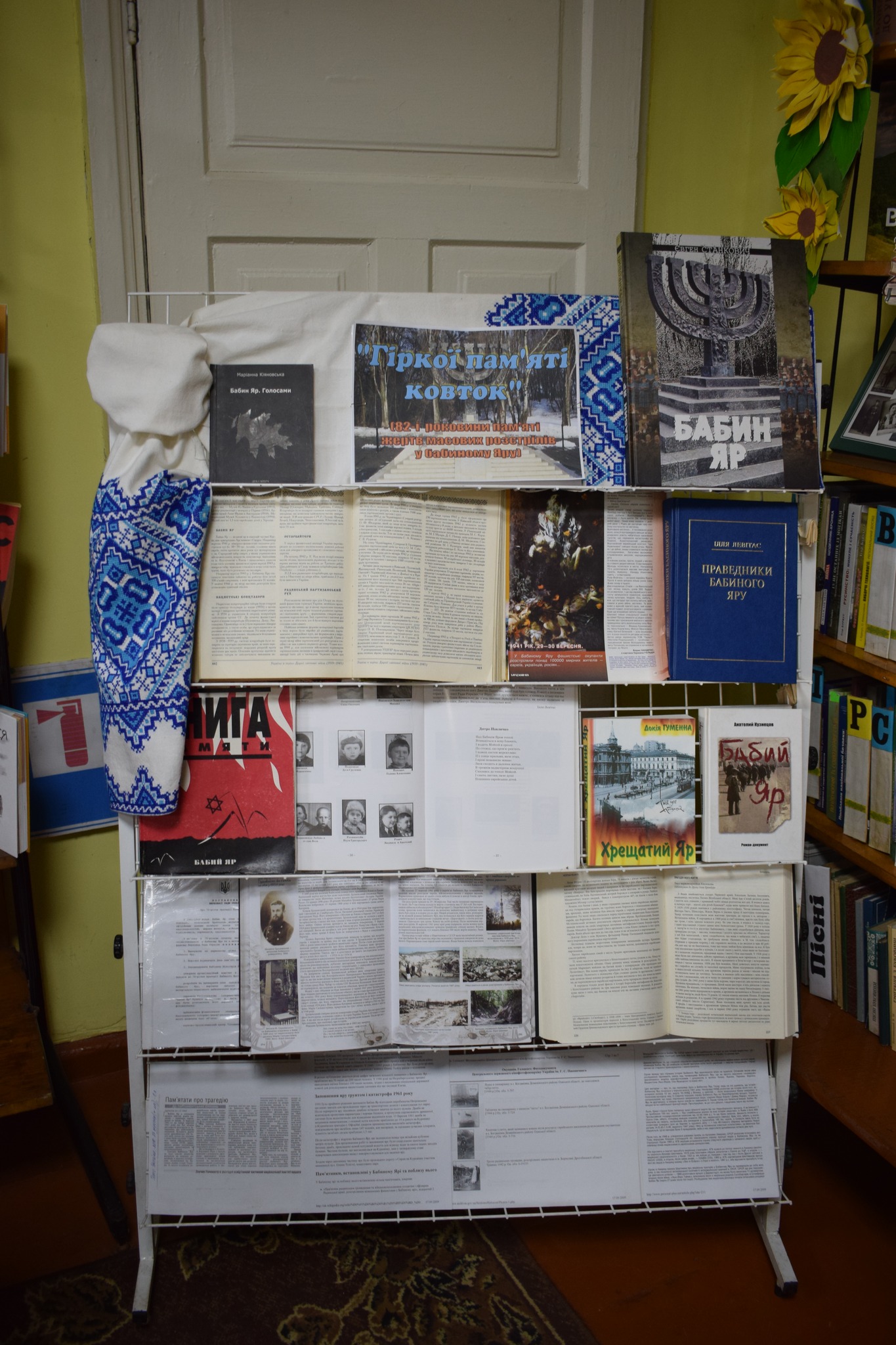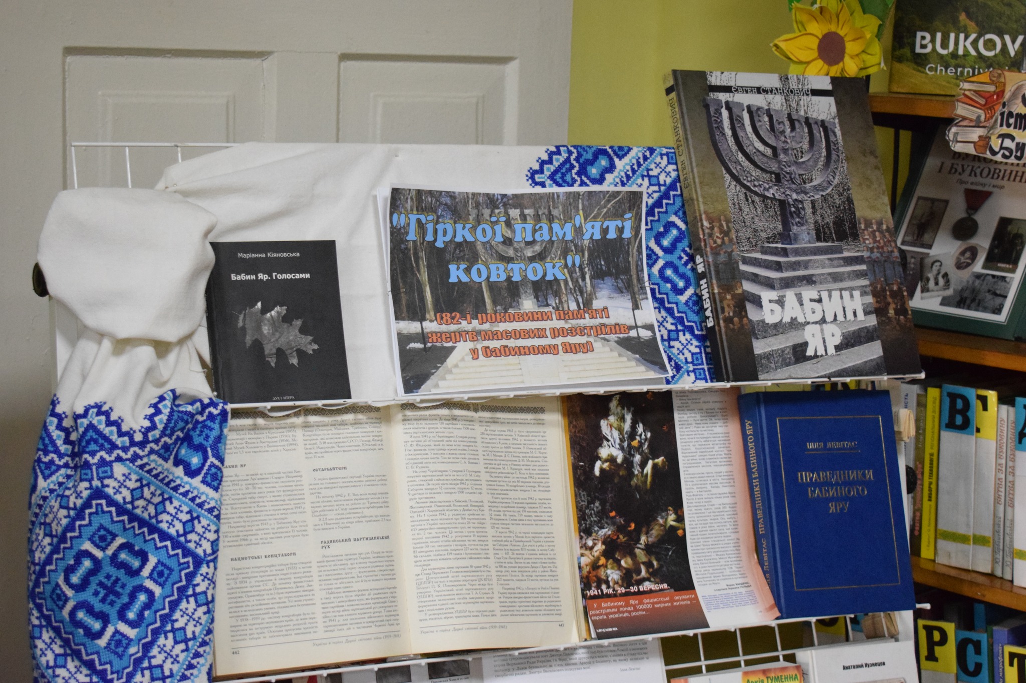 Увагу присутніх привернула книжкова виставка, на якій представлені монографії, публікації, прозові та поетичні твори, що розкривають тему трагедії Бабиного Яру на тлі подій Другої світової війни.