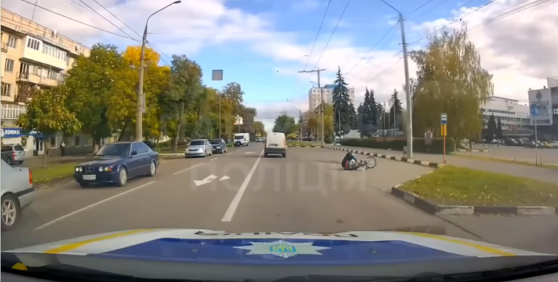 Під час надання допомоги патрульні підтримували розмову із постраждалим, який пояснив, що водій транспортного засобу Ford створив аварійну обстановку, через що він впав.