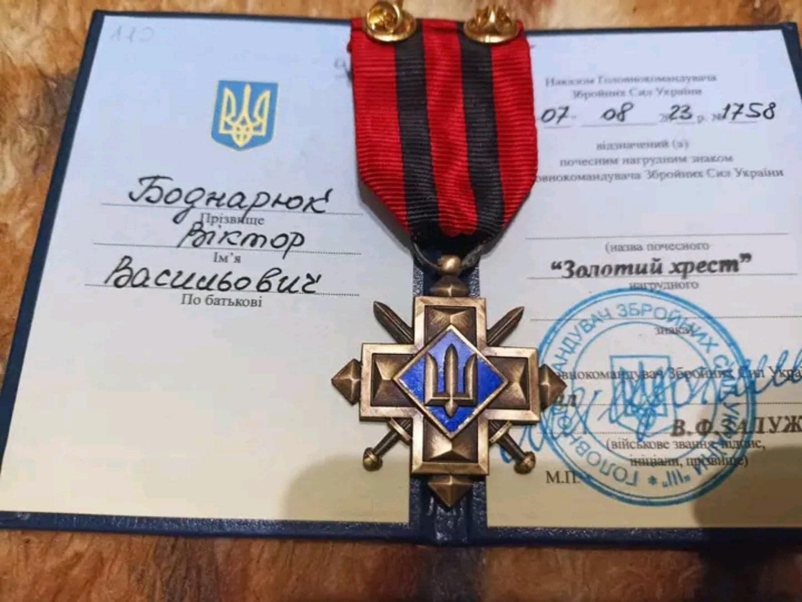 Буковинець Віктор Боднарюк відзначений нагрудним знаком «Золотий хрест» Головнокомандувача ЗСУ Валерія Залужного. Про це повідомляє Чернівецька ОВА у фейсбуку. Раніше військовослужбовець отримав відзнаку Президента «За оборону України».