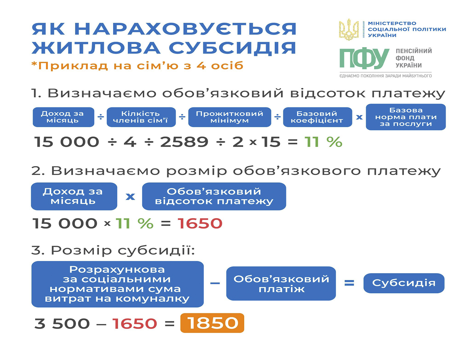 Цей платіж обчислюється індивідуально, за єдиною формулою, і залежить виключно від розміру середньомісячного сукупного доходу домогосподарства на одну особу. Інфографіку про те, як визначається розмір обов’язкового платежу – додаємо.