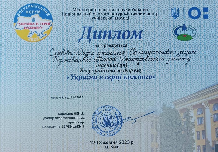 Нещодавно відбувся Всеукраїнський форум «Україна в серці кожного», учасниками якого стали учні закладів загальної середньої освіти з числа переможців та призерів Всеукраїнської дитячо-юнацької еколого-патріотичної гри «Паросток». Серед них  – учениця Селищанського ліцею Дар’я Сливка, яка гідно презентувала результати роботи з національно-патріотичного виховання у закладі.