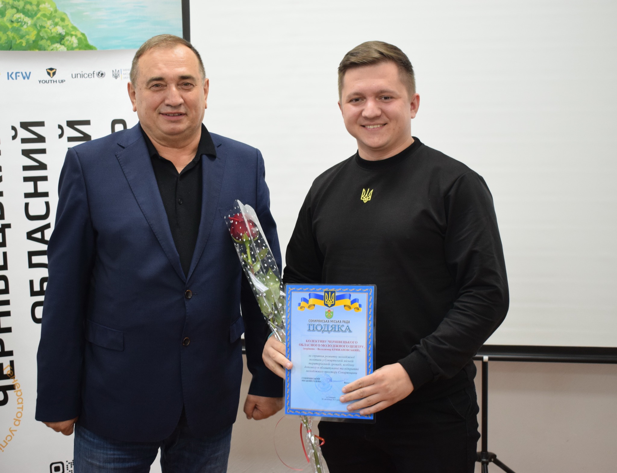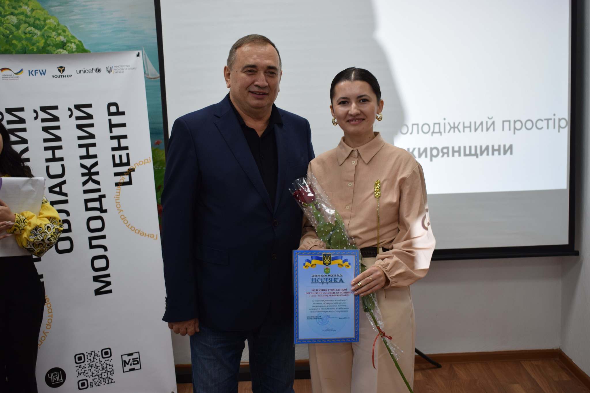 «Хочу подякувати громадській організації «Молодь Буковини» за підтримку у реалізації такого важливого для Сокирянської громади соціального проекту, а також за обладнання, яке надано для облаштування приміщення. Впевнений, що молодіжний простір стане осередком, де підростаючому поколінню буде цікаво проводити вільний час, навчатись, розвиватись, спілкуватись з однолітками. Сучасна та креативна молодь Сокирянщини – це наше спільне майбутнє, майбутнє нашої держави. Наше спільне завдання створити всі умови, аби їм було цікаво та, в першу чергу, змістовно і з користю проводити своє дозвілля» – зазначив міський голова Василь Козак та вручив Подяки Сокирянської міської ради гостям заходу – Володимиру Крижановському та Марії Бесарабі.