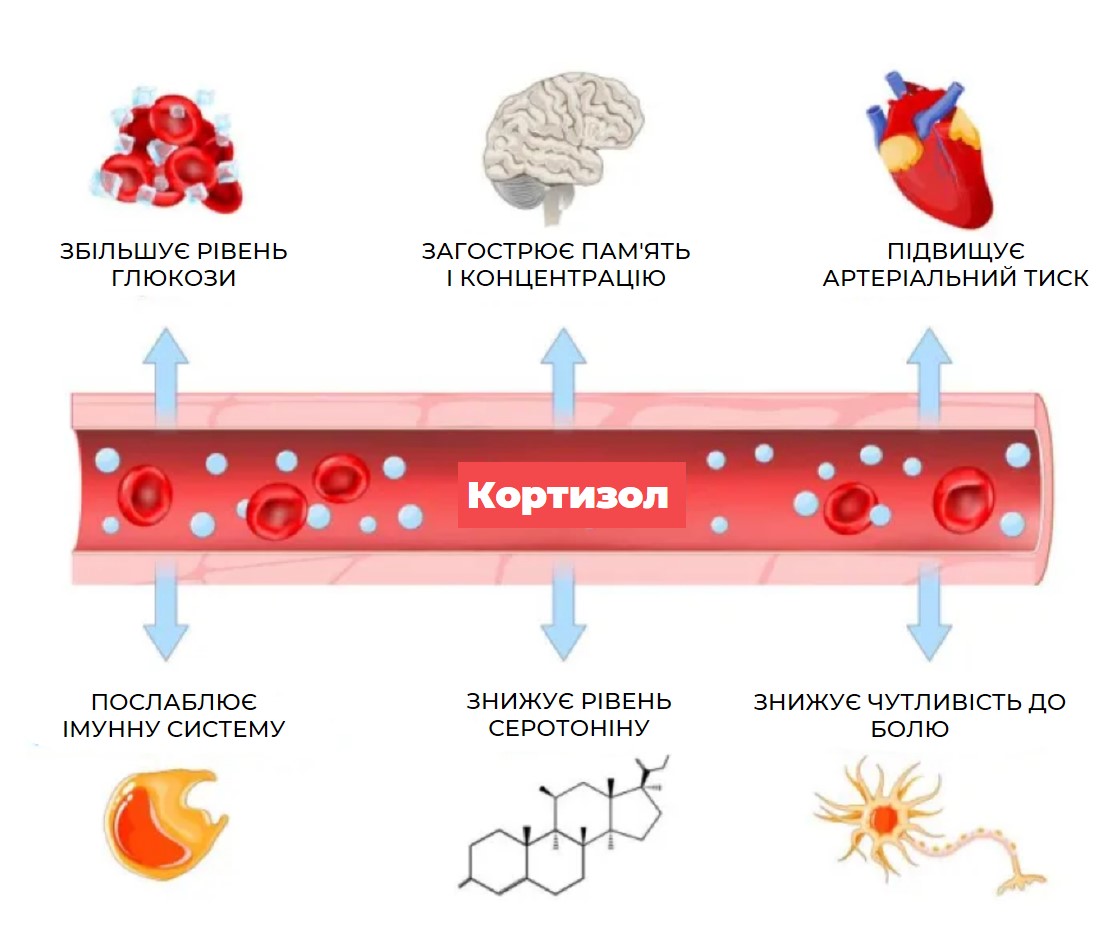 Кортизол може впливати практично на кожну систему наших органів у т.ч.: нервову, імунну, серцево-судинну, дихальну, репродуктивну, кістково-м’язову, покривну.