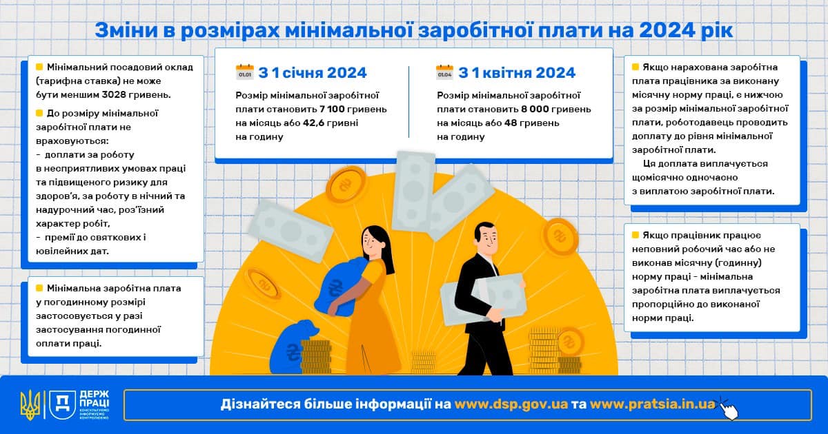 Відповідно до статті 8 Закону України «Про Державний бюджет України на 2024 рік», з першого січня 2024 року мінімальна заробітна плата в країні становить 7 100 гривень. У погодинному розмірі – 42,6 гривні.