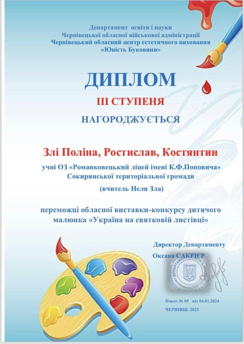 ІІІ місце – Поліну ЗЛУ, Ростислава ЗЛОГО, Костянтина ЗЛОГО, учнів ОЗ «РОМАНКОВЕЦЬКИЙ ЛІЦЕЙ імені К.Ф.ПОПОВИЧА (керівник: Неля ЗЛА).