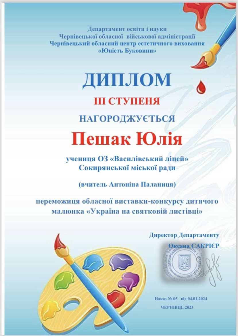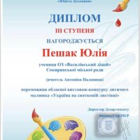 ІІІ місце – Юлію ПЕШАК, ученицю ОЗ «ВАСИЛІВСЬКИЙ ЛІЦЕЙ» (керівник: Антоніна ПАЛАНИЦЯ).