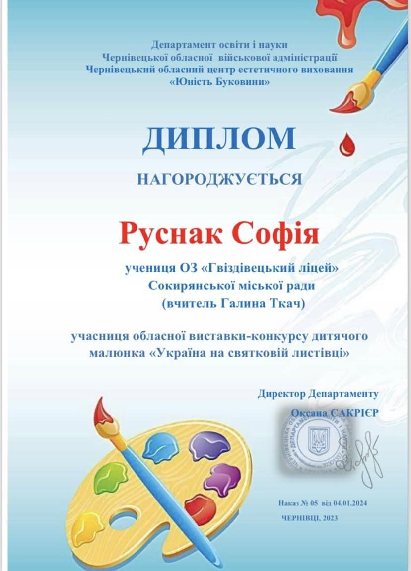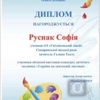 Дипломант – Софія РУСНАК, ученицю ОЗ «ГВІЗДІВЕЦЬКИЙ ЛІЦЕЙ» (керівник: Галина ТКАЧ).