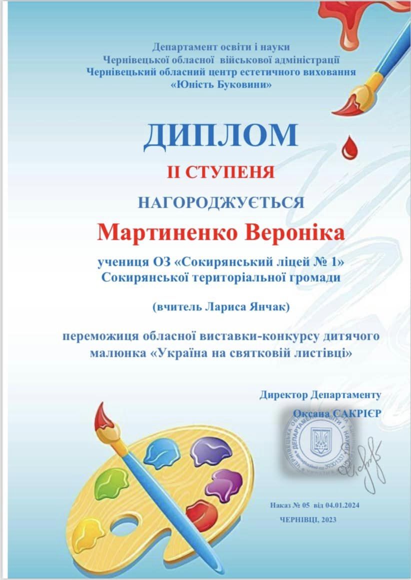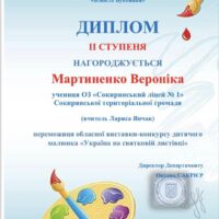 ІІ місце – Вероніку МАРТИНЕНКО, ученицю ОЗ «СОКИРЯНСЬКИЙ ЛІЦЕЙ №1» (керівник: Лариса ЯНЧАК);