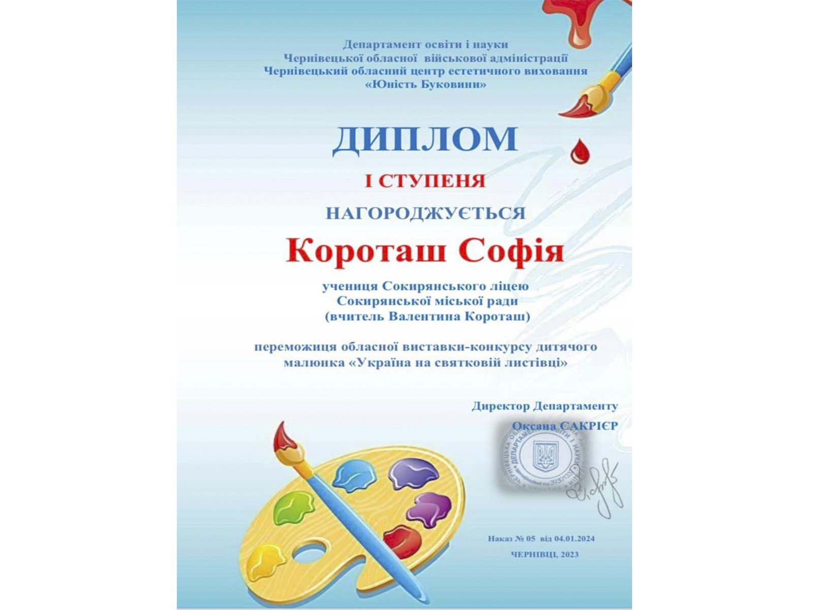 І місце – Софію КОРОТАШ, ученицю СОКИРЯНСЬКОГО ЛІЦЕЮ (керівник: Валентина КОРОТАШ).