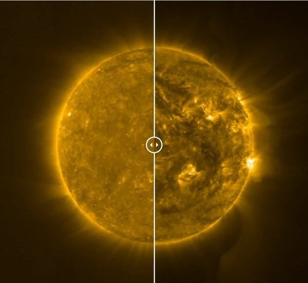 Порівняння двох знімків Сонця — незабаром після мінімуму в лютому 2021 року (ліворуч) та при наближенні до максимуму у жовтні 2023 року (праворуч). Фото: ESA & NASA/Solar Orbiter/EUI Team