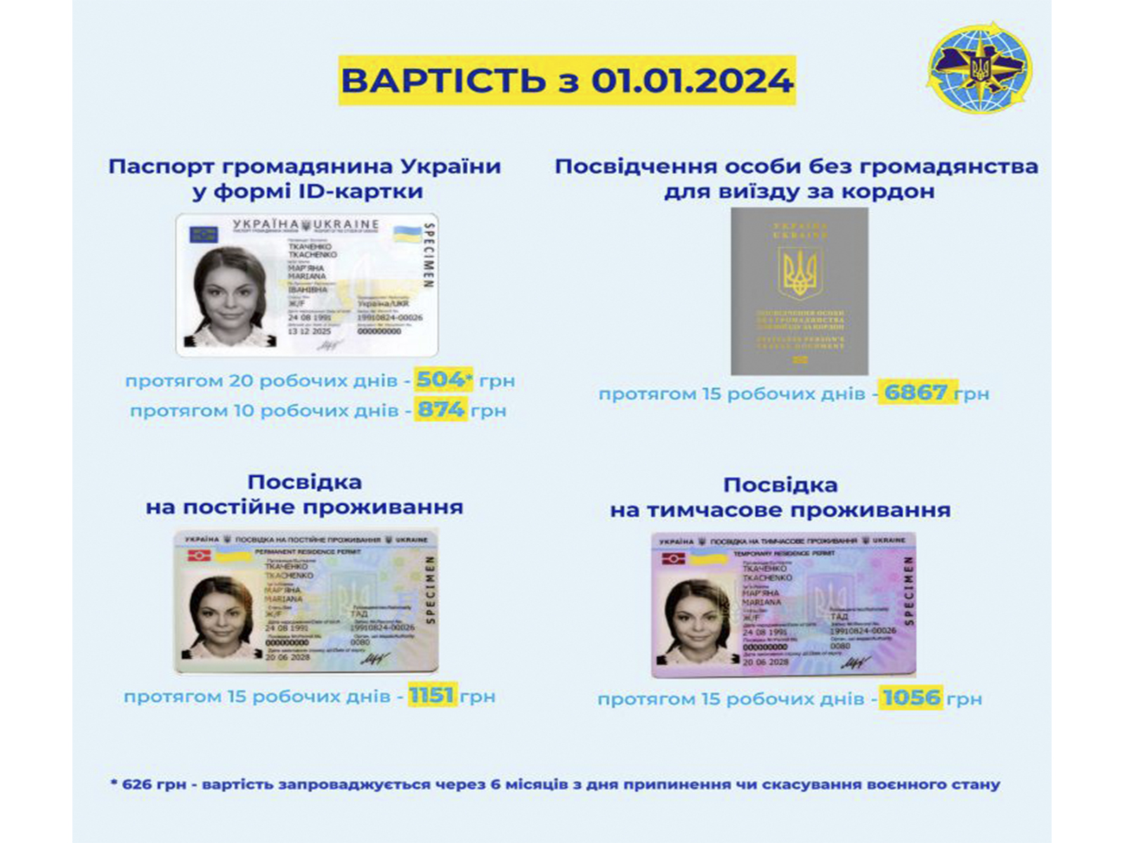 З 1 січня 2024 року ДП «Поліграфічний комбінат «Україна» змінено вартість бланків окремих біометричних документів. У зв’язку з цим зростала і загальна вартість оформлення паспорта громадянина України у формі ID-картки, посвідки на тимчасове або постійне проживання в Україні, а також посвідчення особи без громадянства для виїзду за кордон.