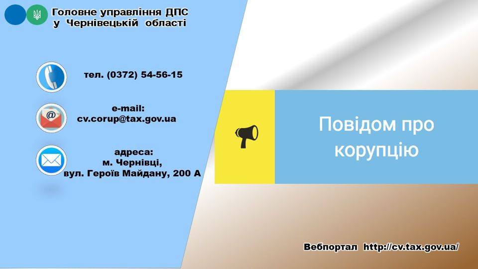 У Головному управлінні ДПС у Чернівецькій області звертають увагу платників податків, про факти порушення антикорупційного законодавства працівниками ДПС можна повідомити наступними способами: