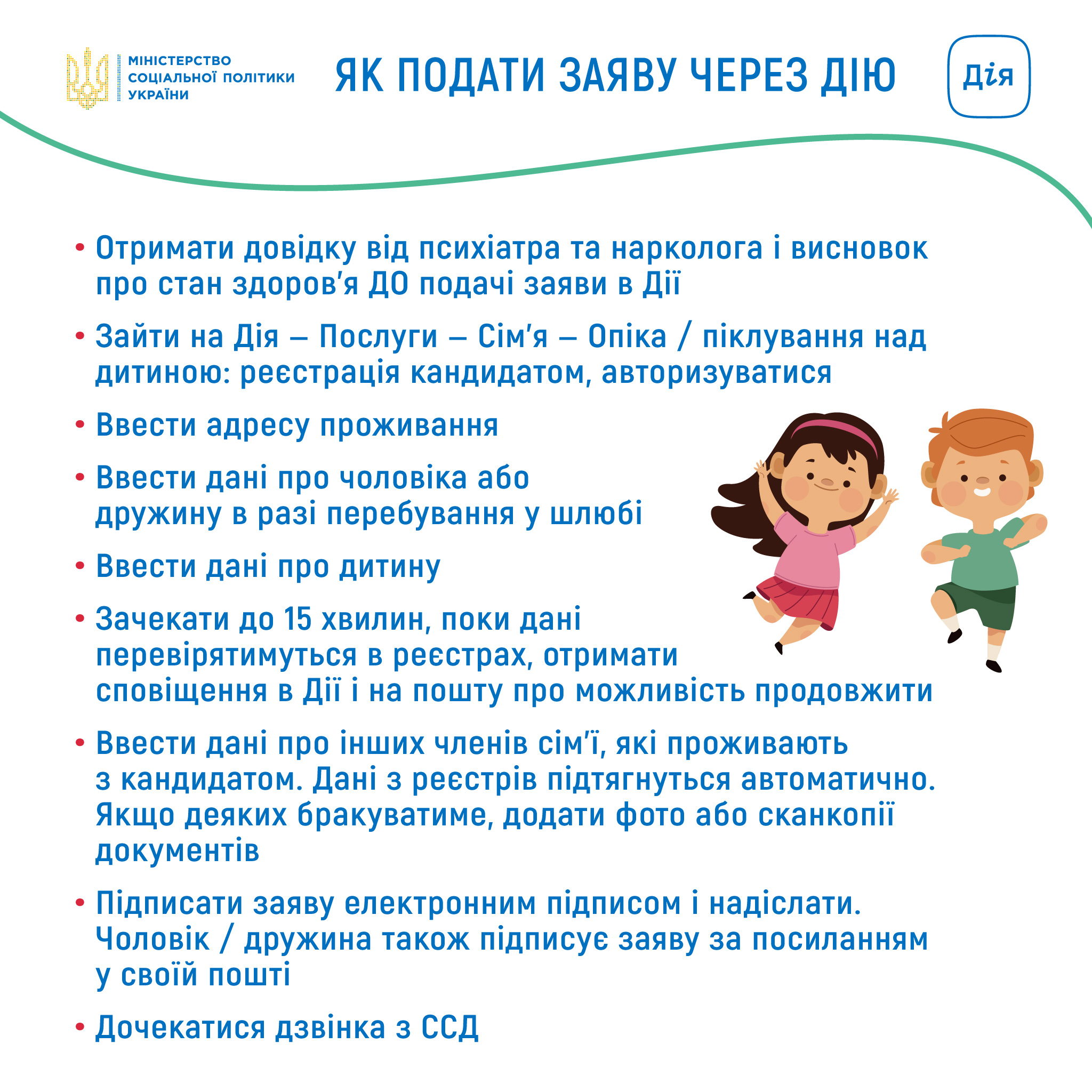 Кандидат подає заяву і документи через Дію або в Службу у справах дітей (ССД).