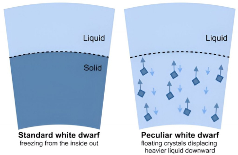 У новому дослідженні астрофізики виявили, що у деяких білих карликів щільність твердих кристалів, що утворюються при замерзанні нижче, ніж у рідини. Тому вони піднімаються на поверхню і витісняють важчу рідину вниз. Транспорт важкого матеріалу до центру зірки вивільняє гравітаційну енергію, якої достатньо, щоби на мільярди років загальмувати охолодження зірки.