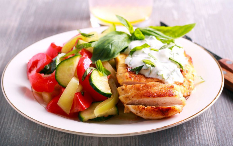 Для приготування салату знадобляться куряче філе, яйця, огірок та несолодкий йогурт.
