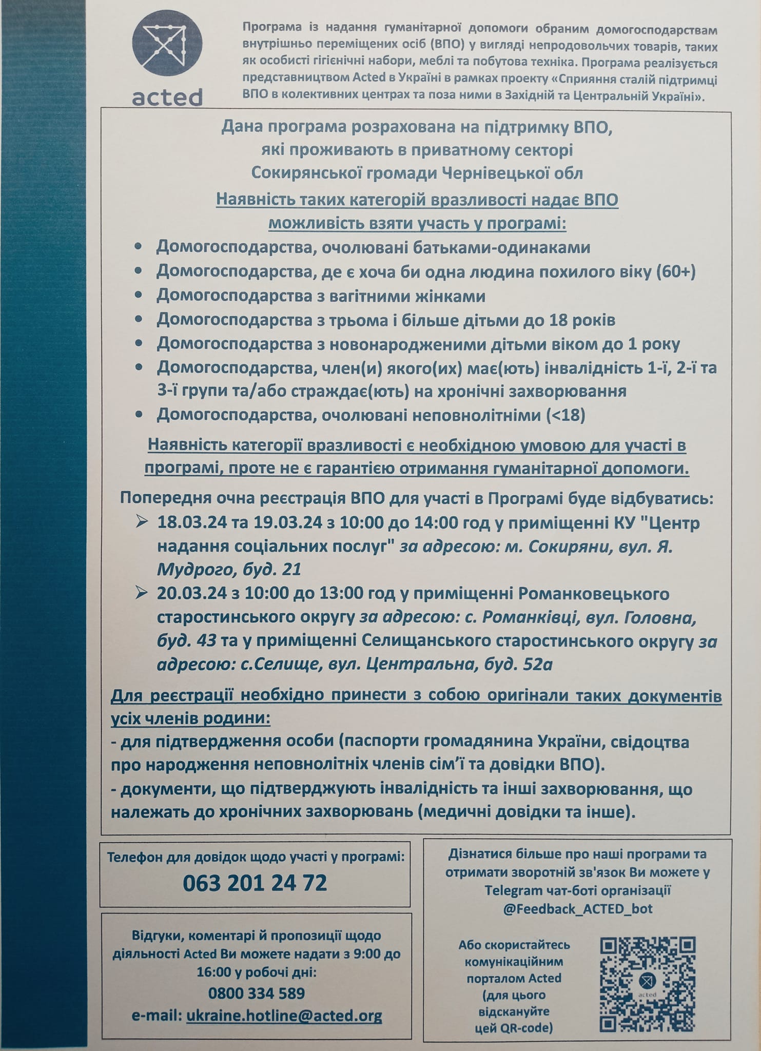 Дана програма розрахована на підтримку ВПО, які проживають у приватному секторі Сокирянської громади.
