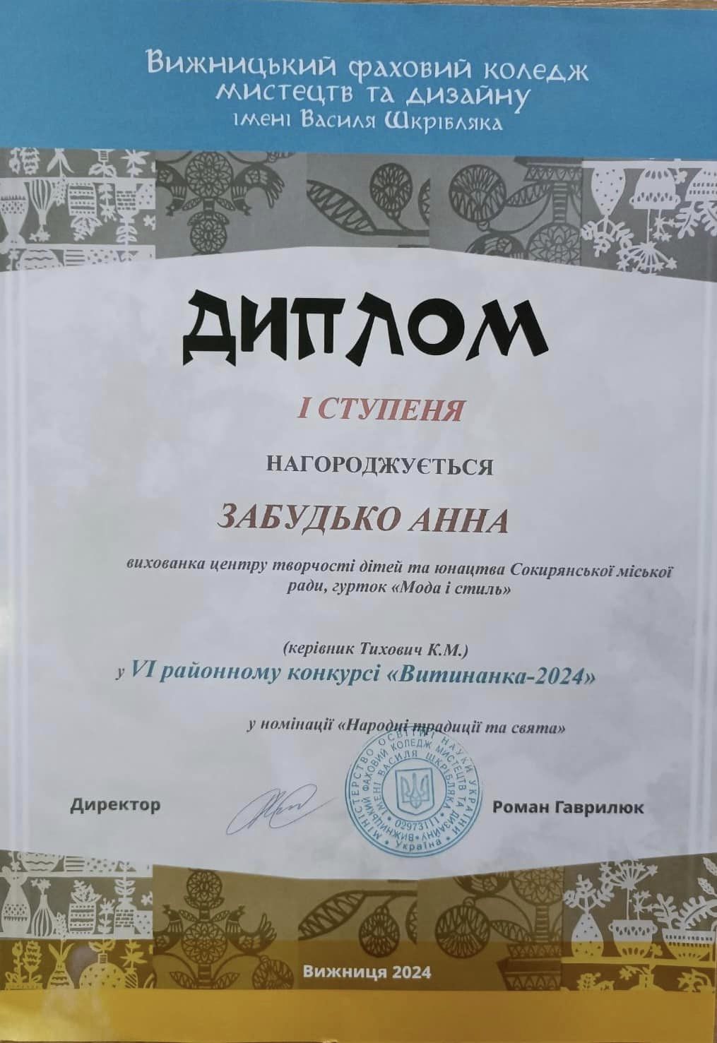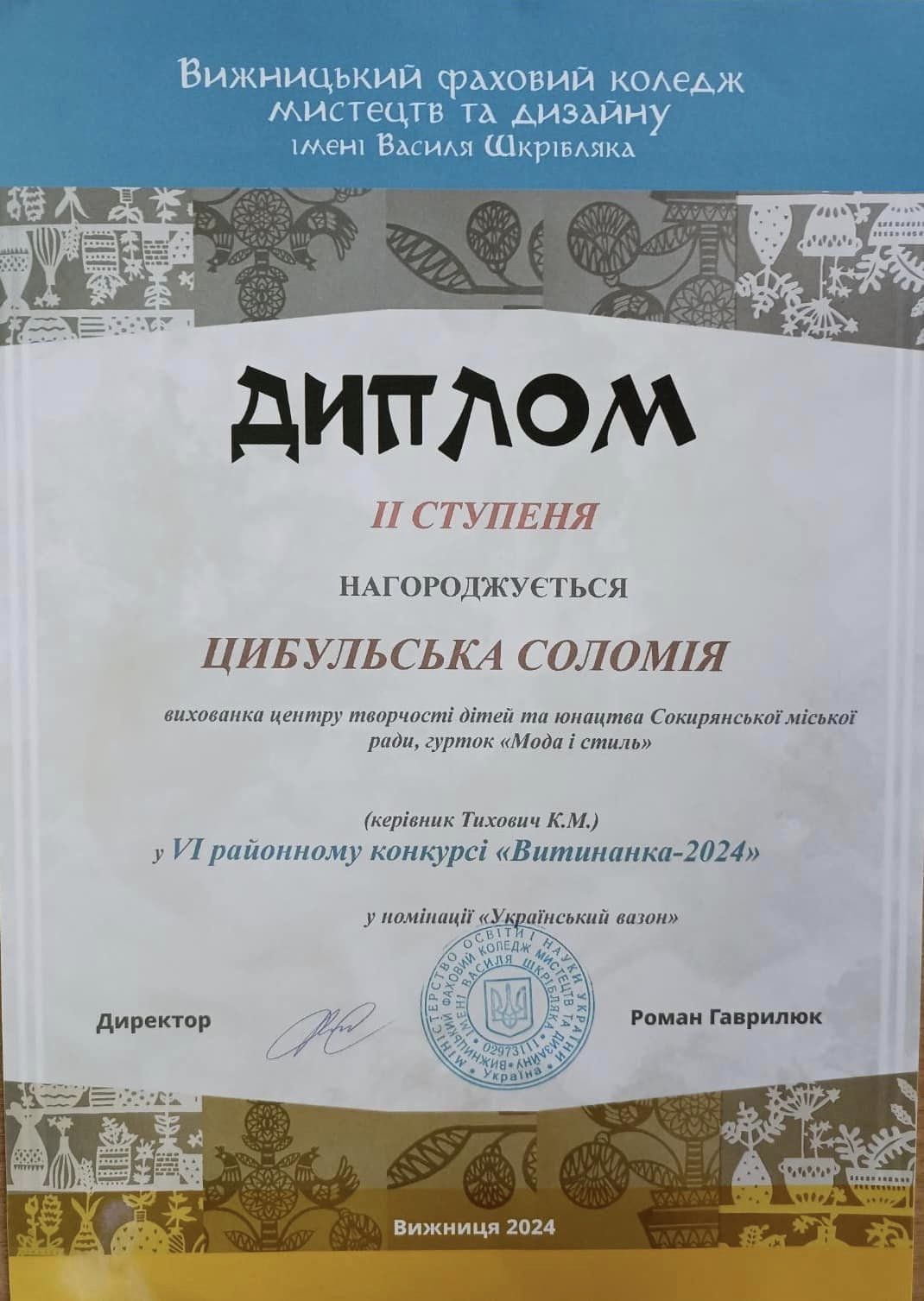 Так, двоє вихованок Центру творчості дітей та юнацтва Сокирянської міської ради увійшли до числа переможців VІ районного конкурсу «Витинанка -2024», який відбувся на базі Вижницького фахового коледжу мистецтв та дизайну імені Василя Шкрібляка. Захід відбувся під девізом: «Від народних джерел до сучасної інтерпретації».