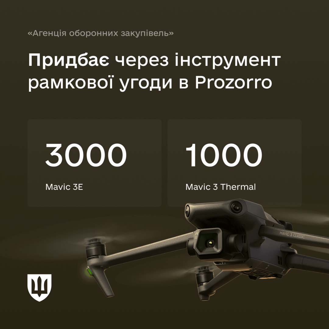 Повідомляється, що в системі Prozorro на сьогодні опубліковані 15 відборів на постачання 200 безпілотних авіакомплексів типу DJI Mavic 3E – усього три тисячі штук. Також оприлюднені п'ять відборів на постачання 200 комплексів типу DJI Mavic 3 Thermal – тисяча штук.
