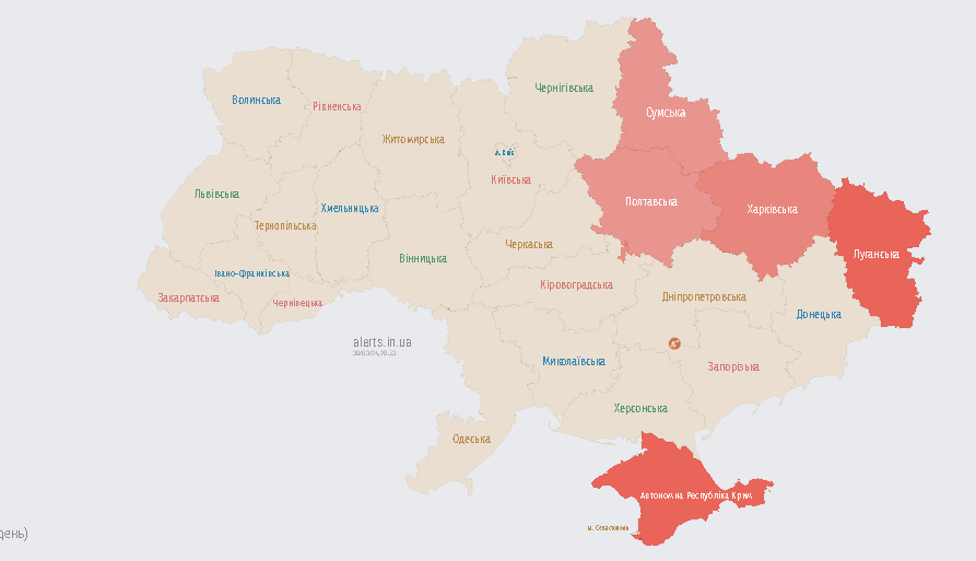 Зараз повітряна тривога оголошена у чотирьох областях.