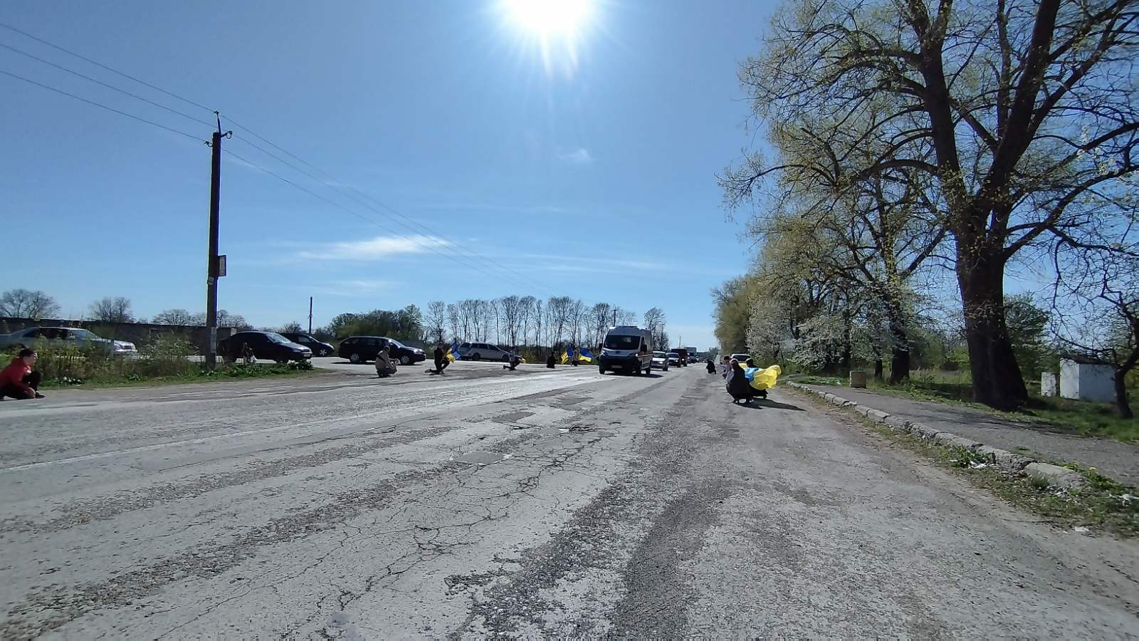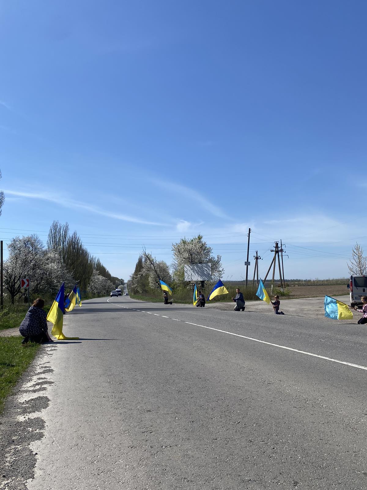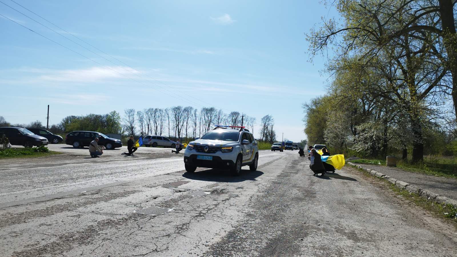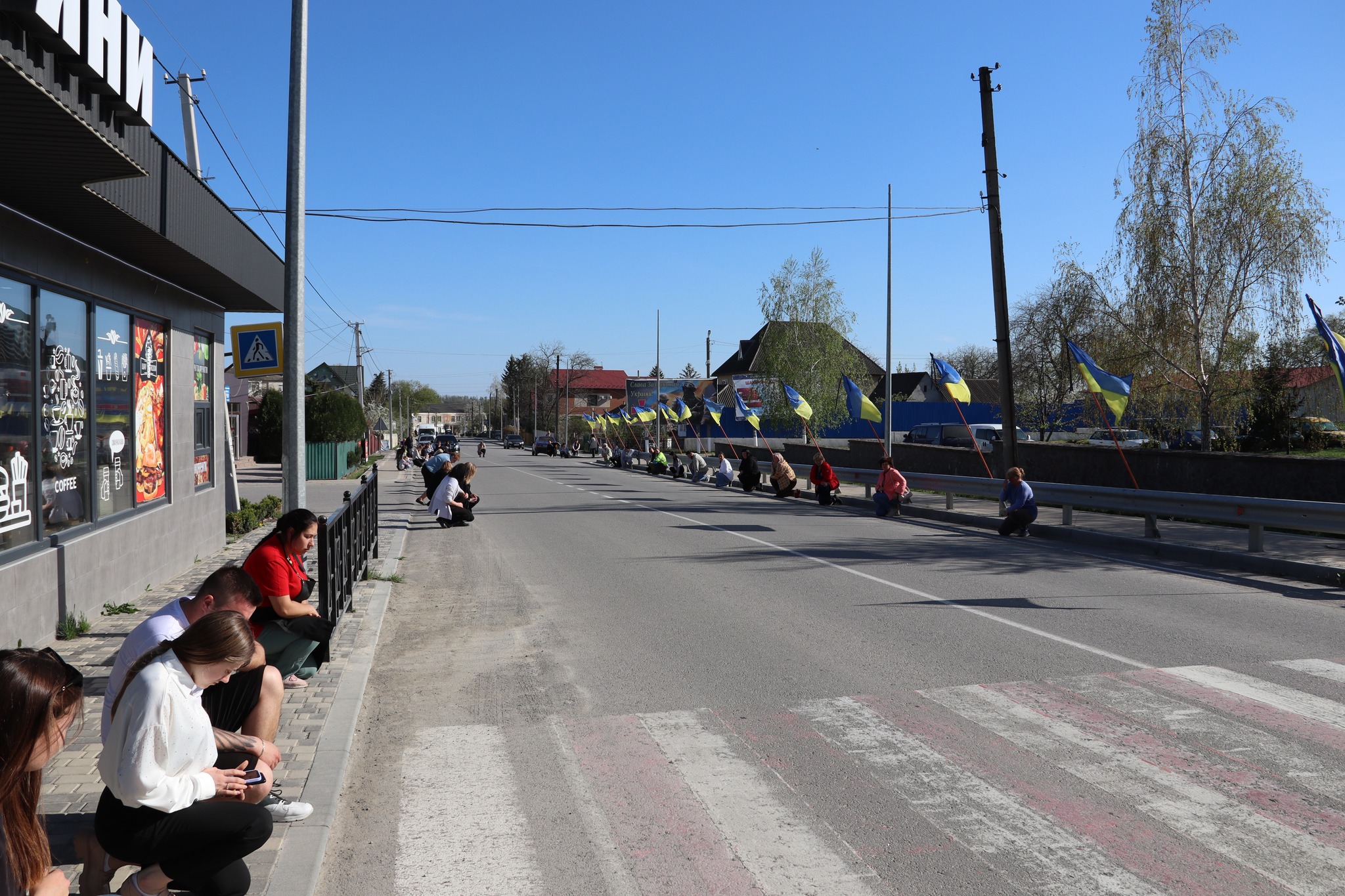 Жителі громади зустрічали воїна вздовж автошляхів краю – з національною символікою, стоячи на колінах.
