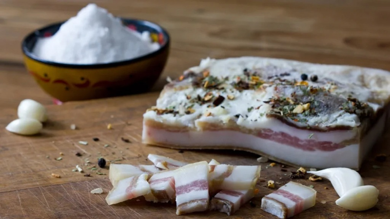 Залишаємо заготовку в приміщенні при кімнатній температурі. Сало буде готове за тиждень.