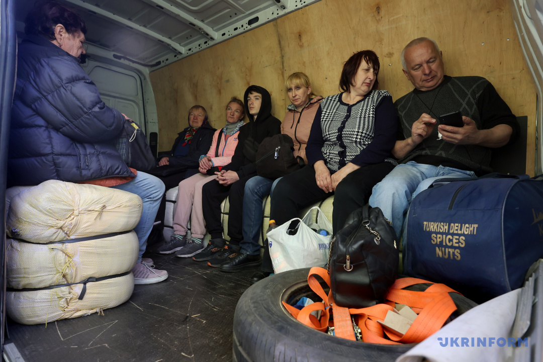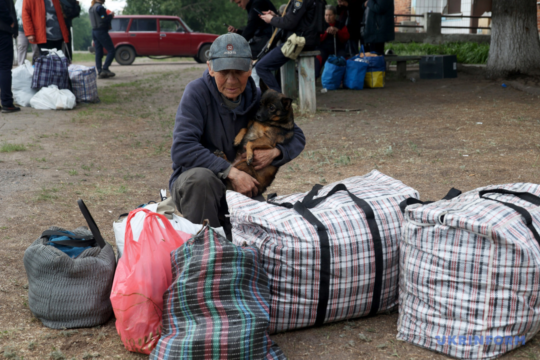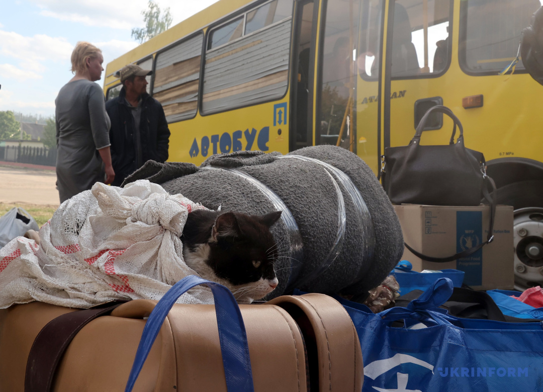 У кількох сумках кожного вимушеного переселенця – все, що вдалося прихопити з дому на перший час. Також люди забирають з собою домашніх тварин і евакуюються, щоб надалі не наражати своє життя на ризик під час постійних щільних обстрілів загарбників.