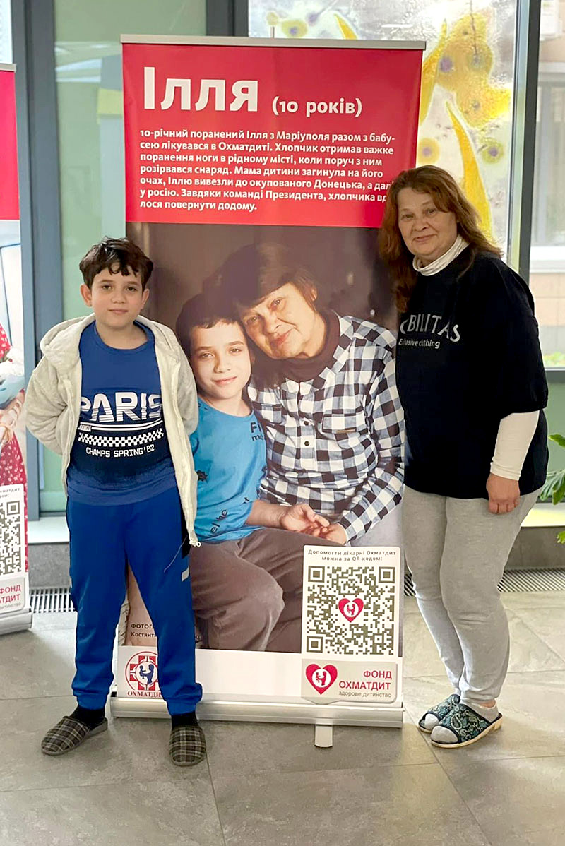 Він – маріуполець. Вони з мамою не встигли евакуюватися з міста до початку повномасштабної війни. Чекали в Маріуполі «зеленого коридору», а коли їхній дім розбомбили, жили у підвалі готелю. Під час одного з обстрілів їх поранило. Мама Іллі змогла дотягнути його до сусідки, але наступної доби померла. Хлопчик мав уламкове поранення стегна. Російські військові забрали Іллю до лікарні в Новоазовськ, далі в Донецьк і збиралися вивезти в Москву. На щастя, дядько випадково побачив небожа в сюжеті про дітей, яких лікували в Донецьку. Тож бабуся Олена Миколаївна терміново оформила опікунство та виїхала за онуком.