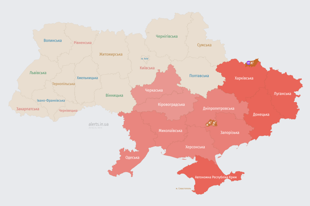 У низці областей оголошено повітряну тривогу через загрозу безпілотників, запущених російськими агресорами.